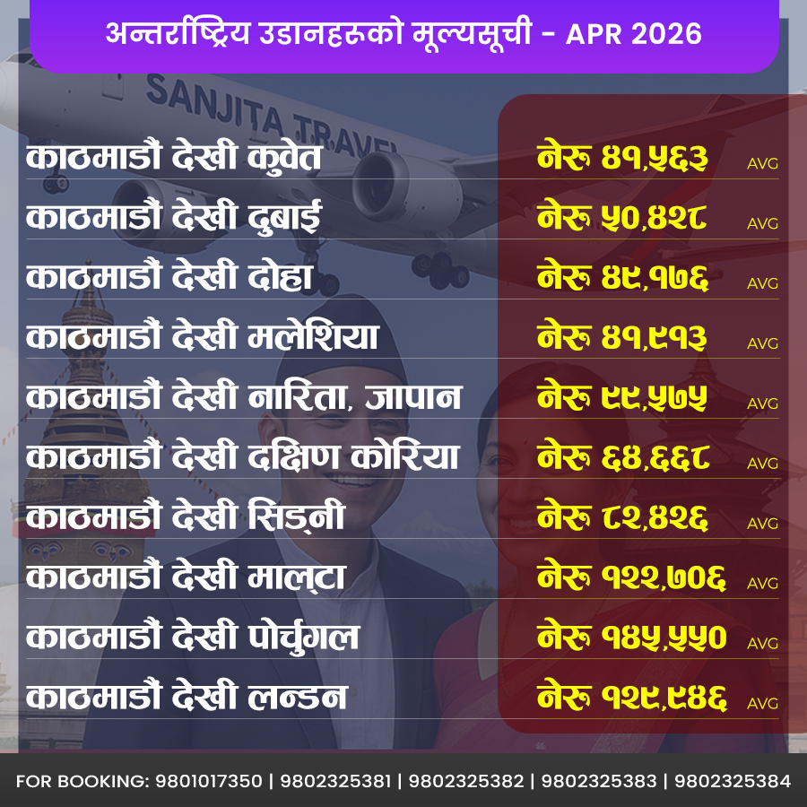 For the most affordable, reliable, and convenient international flights, choose Sanjita Travel and Tours Pvt Ltd, Samakhusi Chowk, Kathmandu, Nepal.